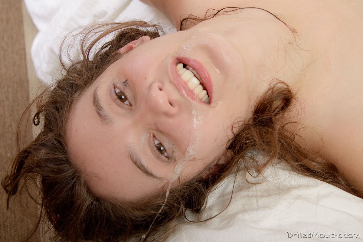 У милой блондинки сперма стекает с языка после окончания в рот -