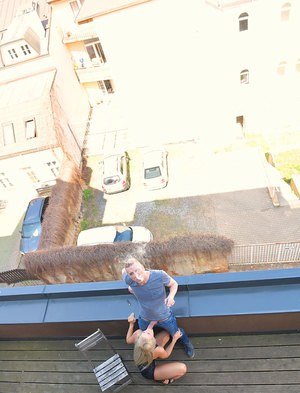 Уличная шлюха на крыше дома делает заглот члена бойфренду