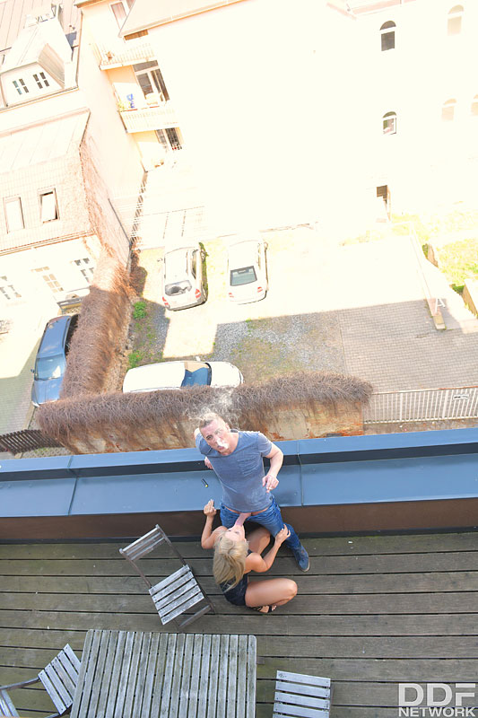 Уличная шлюха на крыше дома делает заглот члена бойфренду